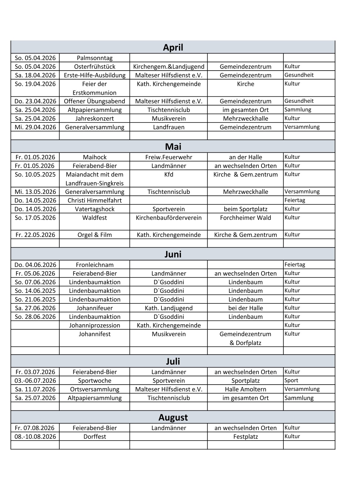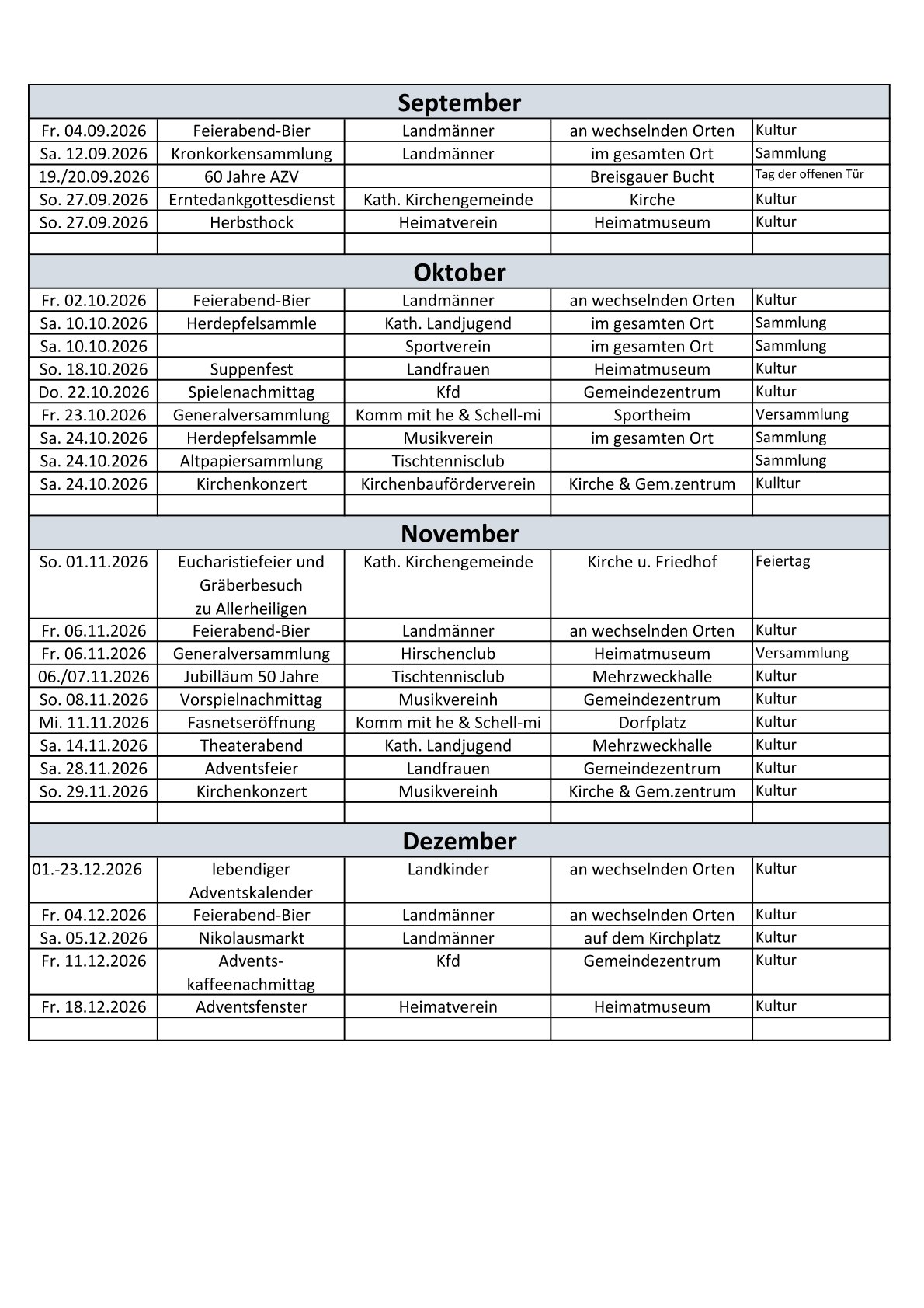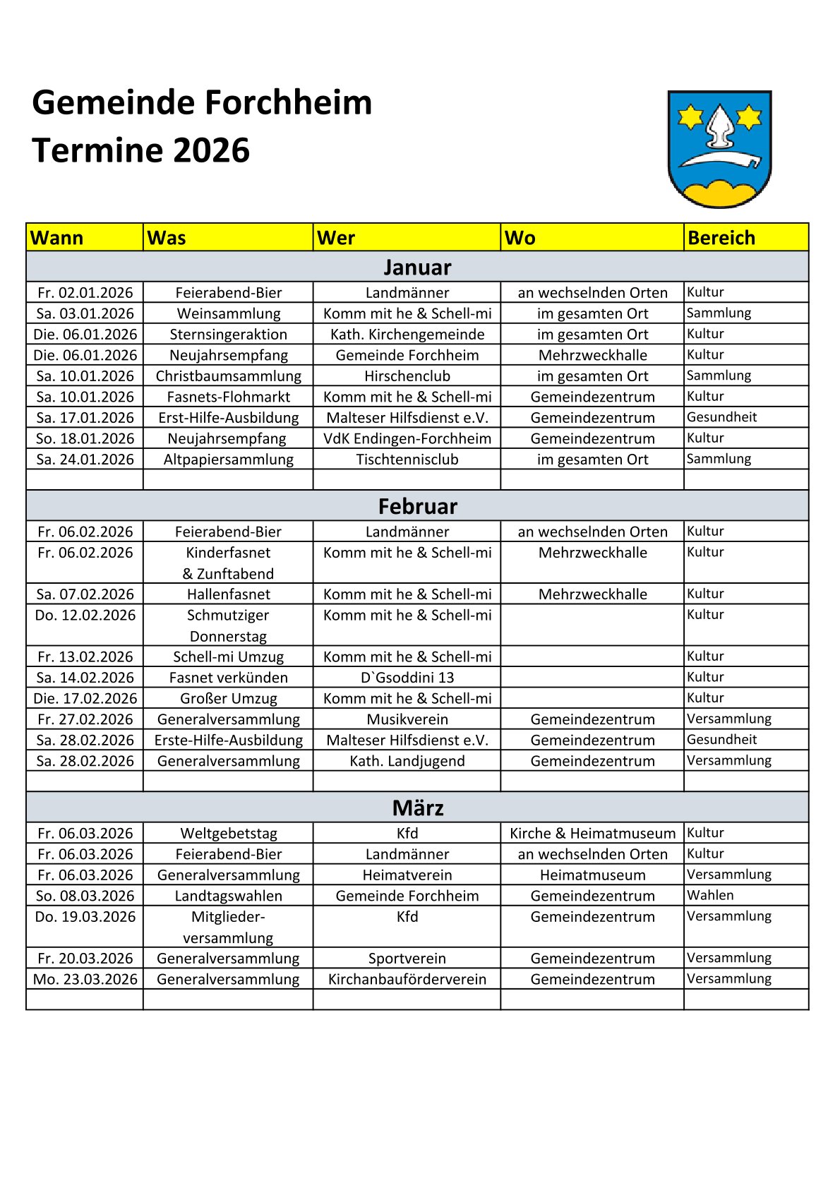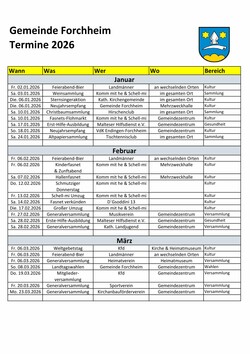 Wir freuen uns auch dieses Jahr auf einen vollen Kalender mit Vereinsversammlungen, Sammlungsterminen der Vereine, und tollen Kulturveranstaltungen zur Fasnetszeit, der Sportwoche und unserem weit über die Dorfgrenzen hinaus bekannten Dorffest oder auch verschiednen Hocks. Darüberhinaus gibt es auch ein paar kulturelle "Geheimtipps" wie das Jahreskonzert des Musikvereins oder das Landjugendtheater im November. Forchheim hat viel zu bieten. Besuchen Sie uns. Sie sind herzlich willkommen!